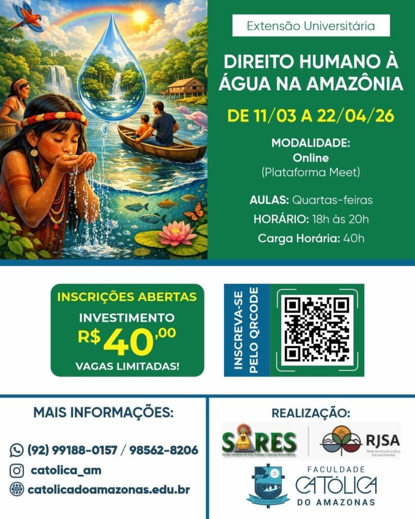 O Curso de Extensão Direito Humano à Água na Amazônia é promovido pelo Serviço Amazônico de Ação, Reflexão e Educação Socioambiental-SARES, em parceria com a Faculdade Católica do Amazonas. Convidamos às lideranças comunitárias, pesquisadores, acadêmicos, agentes pastorais outros grupos interessados na temática do direito humano à água na Amazônia.