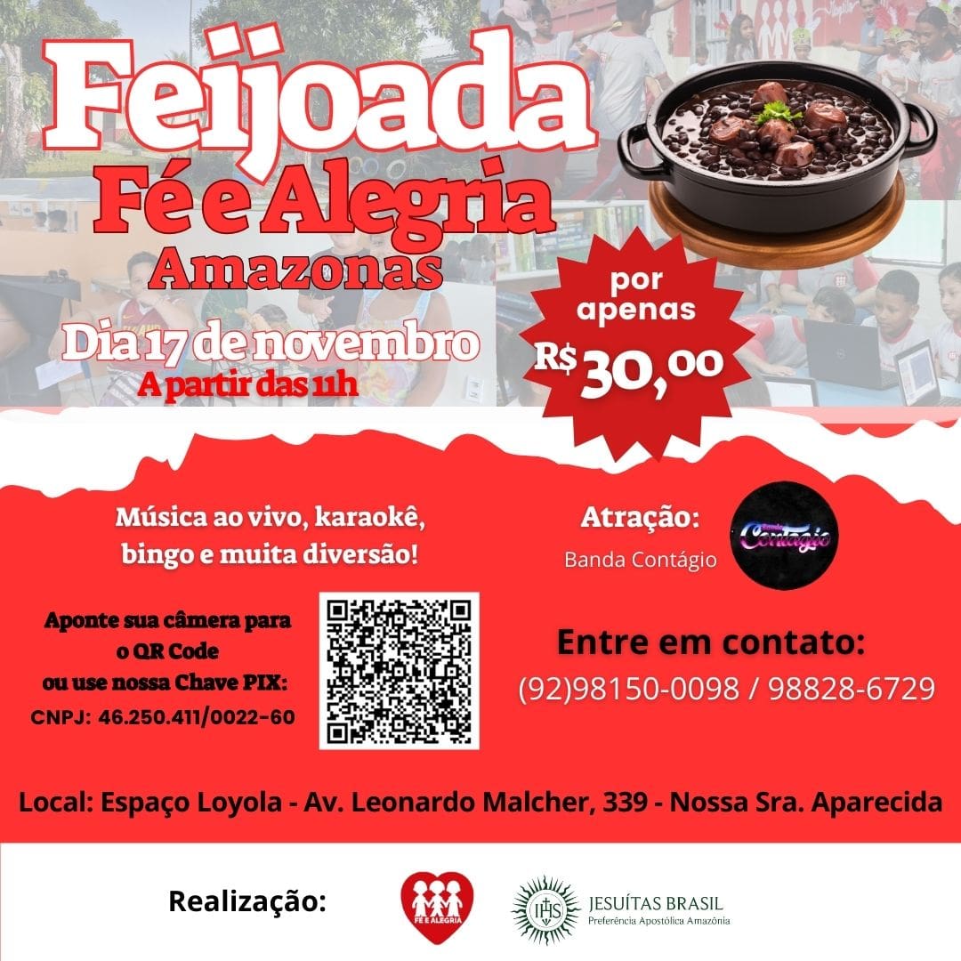 A Fundação Fé e Alegria Amazonas convida a comunidade para participar de sua tradicional Feijoada Solidária, um evento que une sabor e solidariedade. A festa acontece no dia 17 de novembro (domingo), no Espaço Loyola, localizado na Av. Leonardo Malcher, 339, bairro Nossa Sra. Aparecida, a partir das 11h.