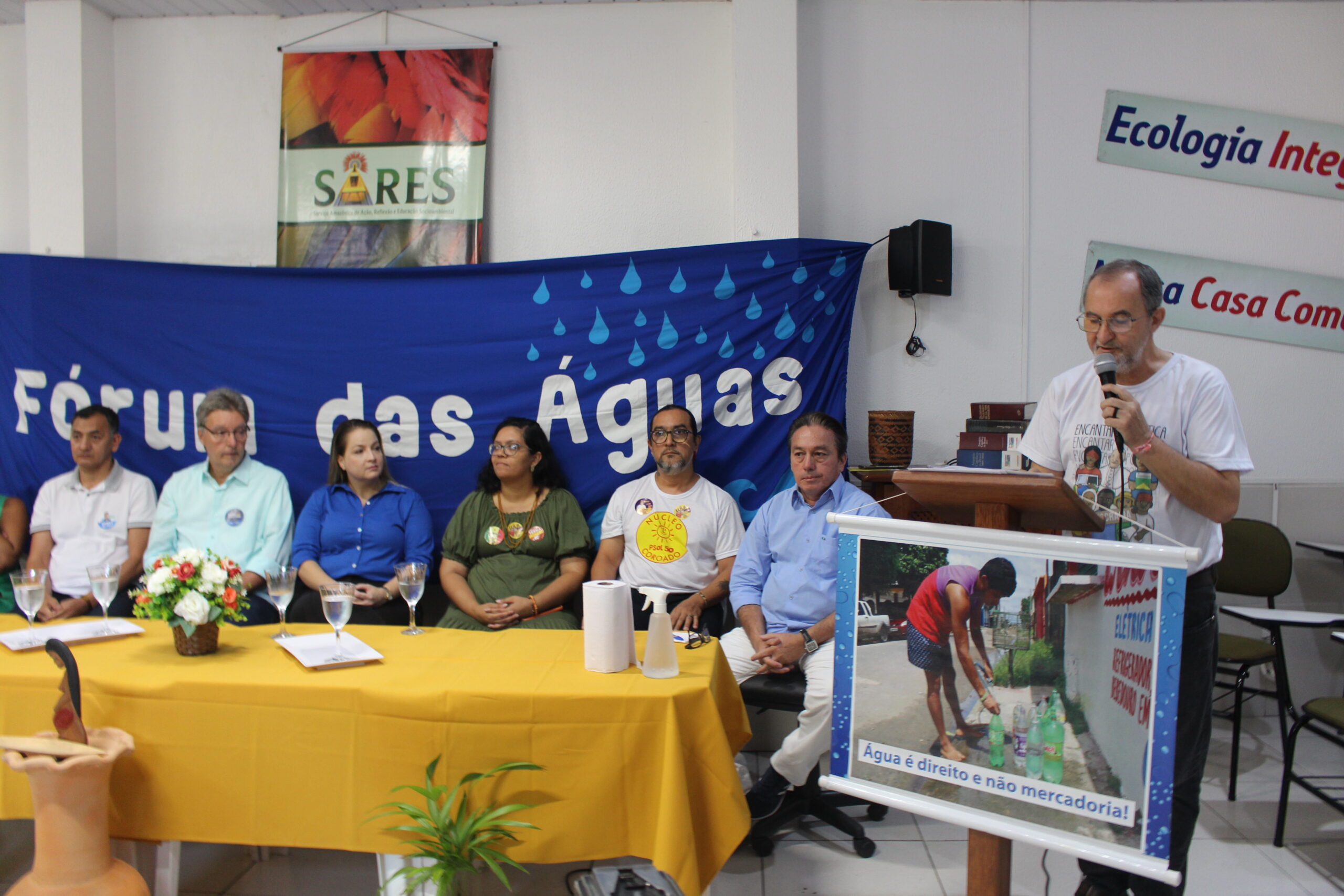 Nossas águas precisam de proteção, assim com as nossas populações. Nossas bacias hidrográficas precisam de cuidado e nossas casas necessitam de saneamento. Nesse sentido, nos propomos lutar contra o capitalismo selvagem, em favor da nossa Amazônia que não deve ser reduzida a mercadoria para beneficiar os grandes empresários e financistas, em detrimento da qualidade de vida das nossas populações. É necessário buscar alternativas democráticas ao invés de privatizar nossas empresas públicas e nossos bens comuns, como as águas, as florestas, o sistema de saúde, as cidades e a Amazônia.